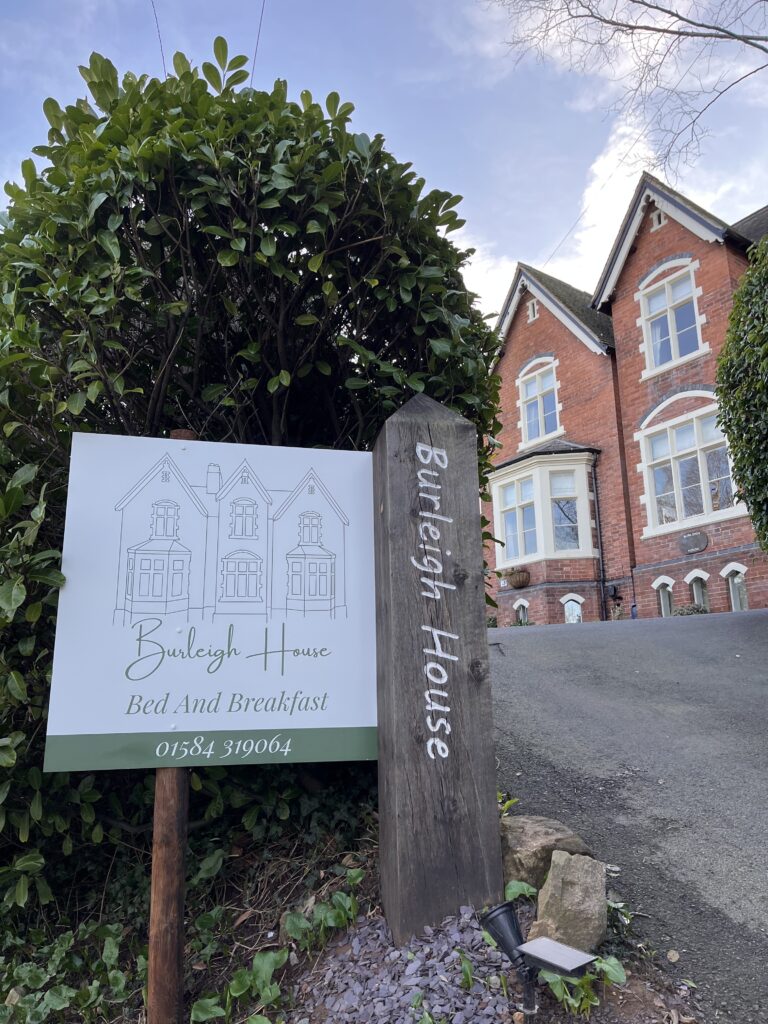Burleigh House is situated on the Bromyard Road opposite the blue school railings. Look out for the oak post sign at the end of the drive and use WR15 8BZ in your sat-nav.